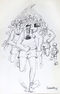 Al irse encauzando la que sería primera edición de la Carrera Pedestre Popular de Santiago en 1978, tuve la pretensión de que distintos dibujantes confeccionaran el cartel de la prueba y que lo hicieran de manera altruista. Pensé que, transcurridos una serie de años, sería magnífico encontrarse con una atractiva galería que pudiera mostrarse en alguna exposición (esto último no fraguó ya que, una vez dejada la organización, hubo algún autor que repitió varias veces). Pero en un principio fue consolidándose la iniciativa de manera satisfactoria. El entrenador Mariano García-Verdugo, del que había visto dibujos humorísticos, no puso reparo alguno e hizo el primero con su fina destreza. Bernardo Saavedra Pita, en 1979, ofreció un mosaico de doce caricaturas (José María Suárez Núñez, Jesús Precedo Lafuente, José Antonio Souto Paz, Pepe Alvite…) que tuvieron una indescriptible aceptación. Brillante también estuvo, en 1983, el humorista gráfico Gogue (nos acercamos a él a través de su primo Alejandro López Barral, atleta e integrante de la organización de la carrera) y no menos brillante se mostró dos años antes, en 1981, el gran Fernando Quesada (Ourense, 1933-Vigo, 2016) con el dibujo que ilustra este texto y consiguió un amigo, Javier Díaz Ferreiro. El dibujo de Quesada, sin embargo, a mi modo de ver, no quedó reflejado en el cartel lo que en realidad es. La imprenta no lo realizó cómo estaba previsto. Pero aquí queda como testimonio de su talento y de ese pedestrismo abierto a todos.