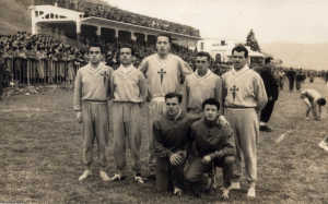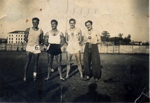 Y la otra imagen, más sosegada, de corazones en reposo, en el mismo recinto, donde se aprecia con nitidez a la izquierda el Colegio Mayor Rodríguez Cadarso –construido en 1940-, nos muestra a cuatro atletas posando, acaso como componentes de un equipo de relevos. Se desconoce la identidad del primer hombre de la izquierda, pero a su lado están el citado Francisco Domínguez Sobral, su hermano José Ramón y el santiagués Juan Lorenzo, campeón de España de 400 metros en 1942.
