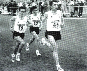 La escena que se vivió en Zarauz (Guipúzcoa) el 6 de marzo de 1994 es de las que se puede considerar como irrepetible. O casi. No es muy frecuente que se produzca, vaya. En el Campeonato de España de cross, los tres lugares del podio fueron ocupados por tres gallegos, José Carlos Adán (39), Carlos de la Torre (42) y Alejandro Gómez (46), por este orden, los tres en la imagen ese 6 de marzo del año 94 decididos hacia la meta, después de que hubieran tenido que padecer (ellos y los demás corredores) el dominio aplastante en buena parte del recorrido del soberbio vasco Martín Fiz. “Era un ritmo infernal, de keniata”, en palabras de Adán, el ganador, que se impuso a sus compañeros de equipo (los tres pontevedreses) faltando una treintena de metros para la meta. El vigués Adán, que había quemado todas sus esperanzas de ser campeón en 1993 al quedar segundo, se encontró por sorpresa con su primer título nacional de cross (el único que obtuvo en su carrera) cuando no se lo esperaba. “Este año no iba con la mentalidad de ser campeón de España porque me había entrenado menos. Pero el deporte es así”, dijo. Lo significativo en todo caso es que estos tres excelentes fondistas (participantes también en los 10.000 metros de los Juegos Olímpicos de Barcelona 1992) fueron protagonistas de una carrera sencillamente memorable.