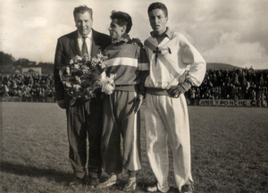 En junio de 1960, la tercera edición del Gran Premio Ciudad de Vigo contó con la participación de un excepcional corredor: el francés Alain Mimoun, campeón olímpico de maratón en Mebourne 1956 y doble medallista de plata, 5.000 y 10.000 metros, en Helsinki 1952. Hasta Balaídos se llegaron cinco mil personas. Mimoun intervino en los 5.000 metros, considerada la mejor prueba de la reunión. Hizo de liebre el coruñés Luis Martínez, posteriormente se puso delante el vigués Carlos Pérez y, a menos de 300 metros para la meta, el catalán Molins se permitió un vigoroso ataque para hacerse con la victoria en 14 minutos 21 segundos. Carlos Pérez quedó segundo (14:22.4) y el portugués Manuel Oliveira tercero (14.23.8). Alain Mimoun acabó en cuarto lugar (14:24.4). Alfonso Posada, quien había ideado el Gran Premio tres años antes, escribió: “Sorprendió Mimoun, que a sus 40 años obtuvo una marca de categoría, dándole ánimos para perseverar con coraje en su preparación olímpica de cara a la Marathon”. También en Vigo estuvo Tomás Barris, el español de mayor proyección internacional; Barris ganó los 1.500 metros (3:52.1). La fotografía nos muestra a varios de aquellos atletas participantes en el Berbés: Jesús Hurtado (1º d), Carlos Pérez (2º d), Alain Mimoun (3º d), el periodista Manuel Tourón (5º d) y Tomás Barris (7º d).