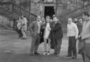 Pasadas las diez de la mañana del domingo 7 de noviembre de 1971, el fondista vigués del Real Club Celta Carlos Pérez llegaba a la Plaza del Obradoiro (primera foto) después de haber hecho corriendo el trayecto desde Vigo a Santiago en seis horas y dos minutos, aunque con varios descansos para recibir masajes. De la ciudad viguesa había partido a las tres de la madrugada, acompañado por algunos atletas (hacían relevos de cinco kilómetros), masajista y tres jueces cronometradores. Carlos Pérez se había recuperado de una complicada lesión y por este motivo había decidido realizar una ofrenda al Apóstol Santiago. Meses atrás, cuando se preparaba en Helsinki para intervenir en la carrera de maratón en los Campeonatos de Europa, tropezó con un objeto metálico y, aunque este percance no le impidió participar en la competición, acabó con una pierna escayolada e internado en un sanatorio de Vigo por espacio de un mes. Después de hacer su entrada en el Obradoiro y habiendo descansado unas horas, Carlos Pérez y su comitiva fue recibido por el deán de la Catedral, Jesús Precedo Lafuente. El atleta se postró ante la imagen del Apóstol Santiago (segunda foto), ofreciéndole al patrón de España la camiseta del Real Club Celta, el pantalón y las zapatillas.