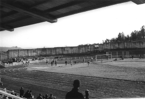Cuando se creó la SD Compostela en 1962, necesitó jugar sus partidos de fútbol en el estadio de la Residencia mientras le preparaban en condiciones el destartalado campo de Santa Isabel. Pero también se hizo necesario que el recinto universitario de la Residencia fuera sometido a un profundo lavado de cara debido a que estaba en una situación lastimosa. Lo cubría una vegetación que había ido creciendo descontrolada, otorgándole a todo aquello un aspecto de abandono y desolación. En condiciones tan lamentables se tiene entrenado, por ejemplo, el santiagués Ángel Calle, realizando sus series por un camino estrecho y pedregoso. Una vez que la SD Compostela lo adecentó y puso visible, circundaba el terreno de juego una pista de atletismo de tierra dura que sirvió para entrenarse los atletas de aquel momento; allí no había competiciones. El estadio de la Residencia, cuya construcción ya se contemplaba en 1930 y que comenzó a levantarse en 1936 en colaboración con la Liga Amigos del País, contó con actividad y vida en los años 40 y fue, para el deporte santiagués, un lugar de encuentro fundamental. En 1966, estando la selección española de fútbol concentrada en la ciudad con vistas al Mundial de Inglaterra, el estadio de la Residencia pudo contar al fin con pistas de ceniza (en la imagen) pero, cierto es, dejaron mucho que desear al ser muy blandas. Aquellas pistas tenían una dimensión de 333,33 metros. Hasta los años 80 no cambiaría su fisonomía.